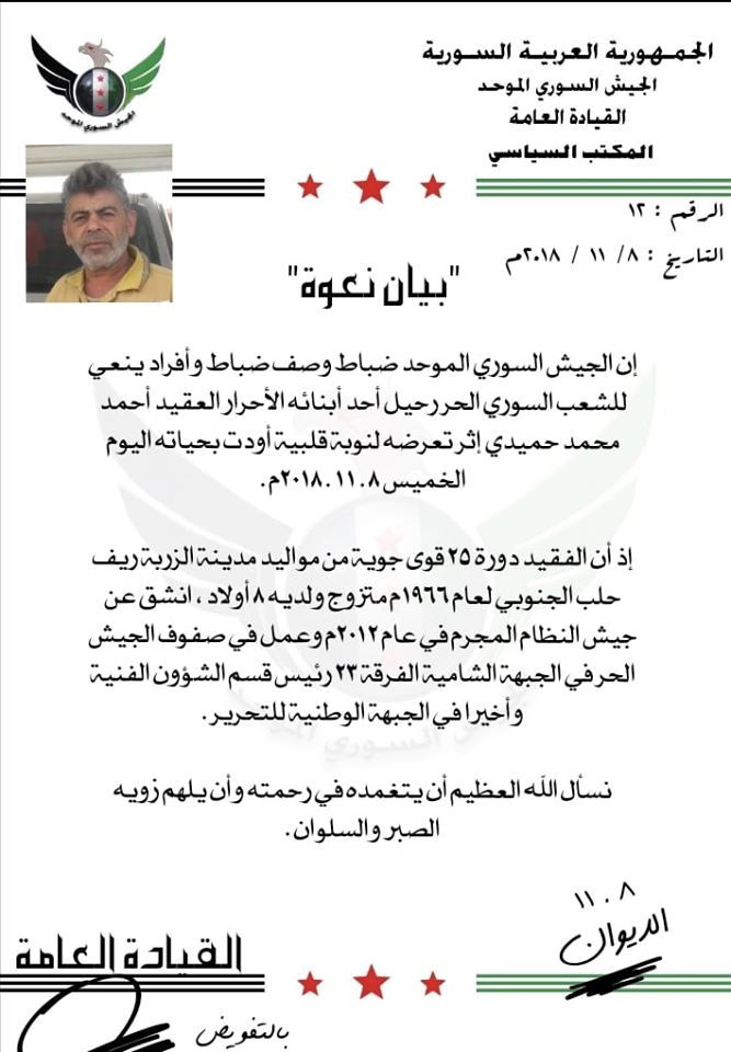 الجيش السوري الموحد يعزي بوفاة العقيد أحمد محمد حميدي