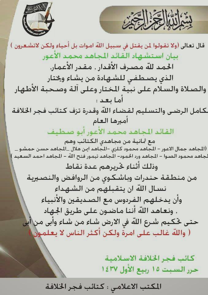 كتائب فجر الخلافة تنعي قائدها محمد الأعور مع مجموعة من مقاتليها على جبهة حندرات