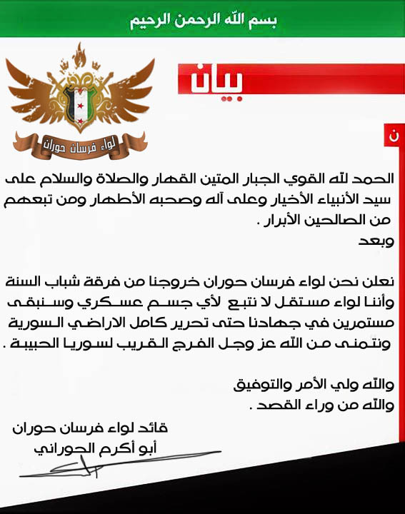 نعلن نحن لواء فرسان حوران خروجنا من فرقة شباب السنة واننا لواء مستقل لانتبع لاي جسم عسكري وسنبقى مستمرين في جهادنا حتى تحرير كامل الاراضي السورية ونتمنى من الله عز وجل الفرج القريب لسوريا الحبيبة