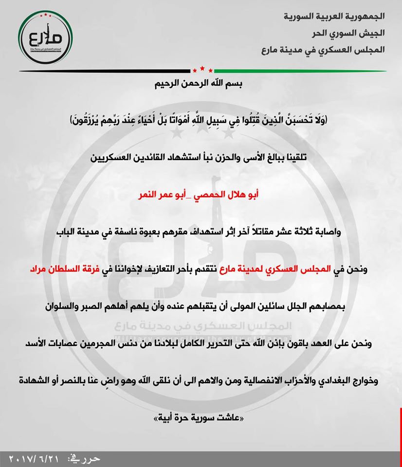 المجلس العسكري في مدينة مارع يعزي فرقة السطان مراد بالقائدين العسكريين فيه أبو هلال الحمصي، وأبو عمر النمر بتفجير في مدينة الباب