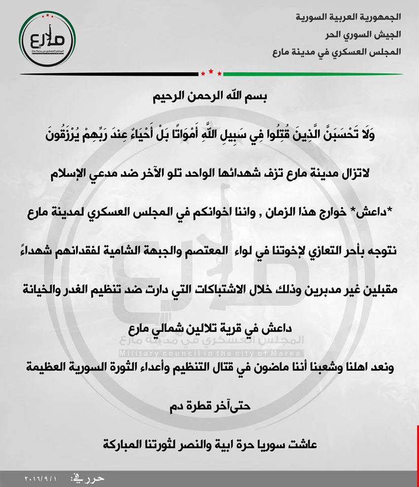 المجلس العسكري في مدينة مارع يعزي الجبهة الشامية ولواء المعتصم بثلة من مقاتليهم على جبهة تلالين ضد تنظيم الدولة