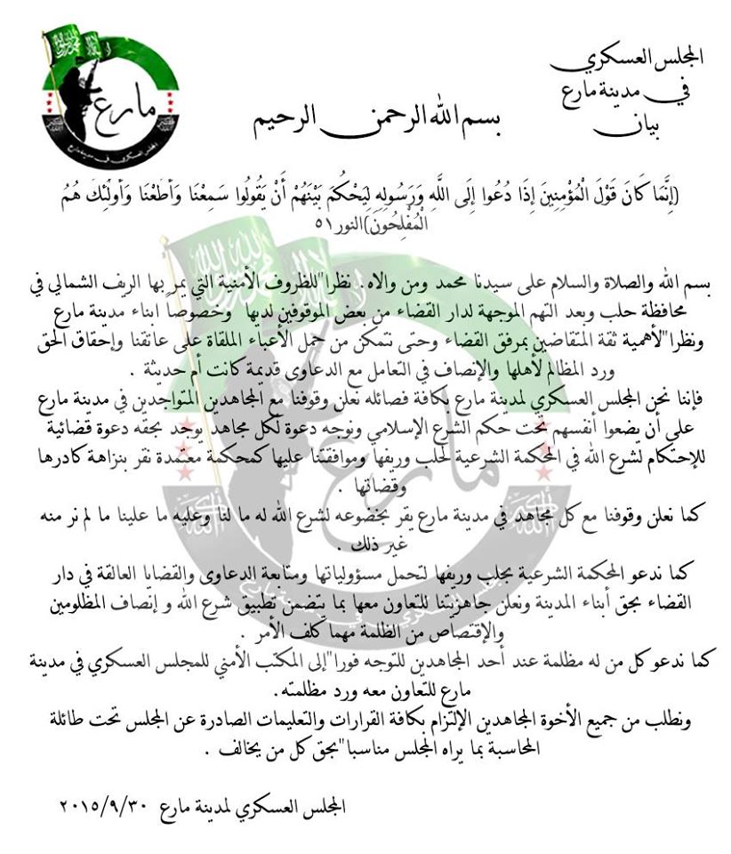 المجلس العسكري في مدينة مارع يعلن وقوفه مع المجاهدين الموجودين في مدينة مارع شريطة أن يضعوا أنفسهم تحت حكم الشرع وإلى الإحتكام للمحكمة الشرعية بحلب وريفها