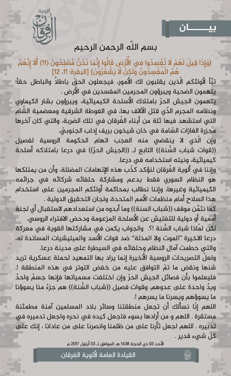 بيان من ألوية الفرقان حول التهمة التي وجهها المحتل الروسي لقوات شباب السنة
