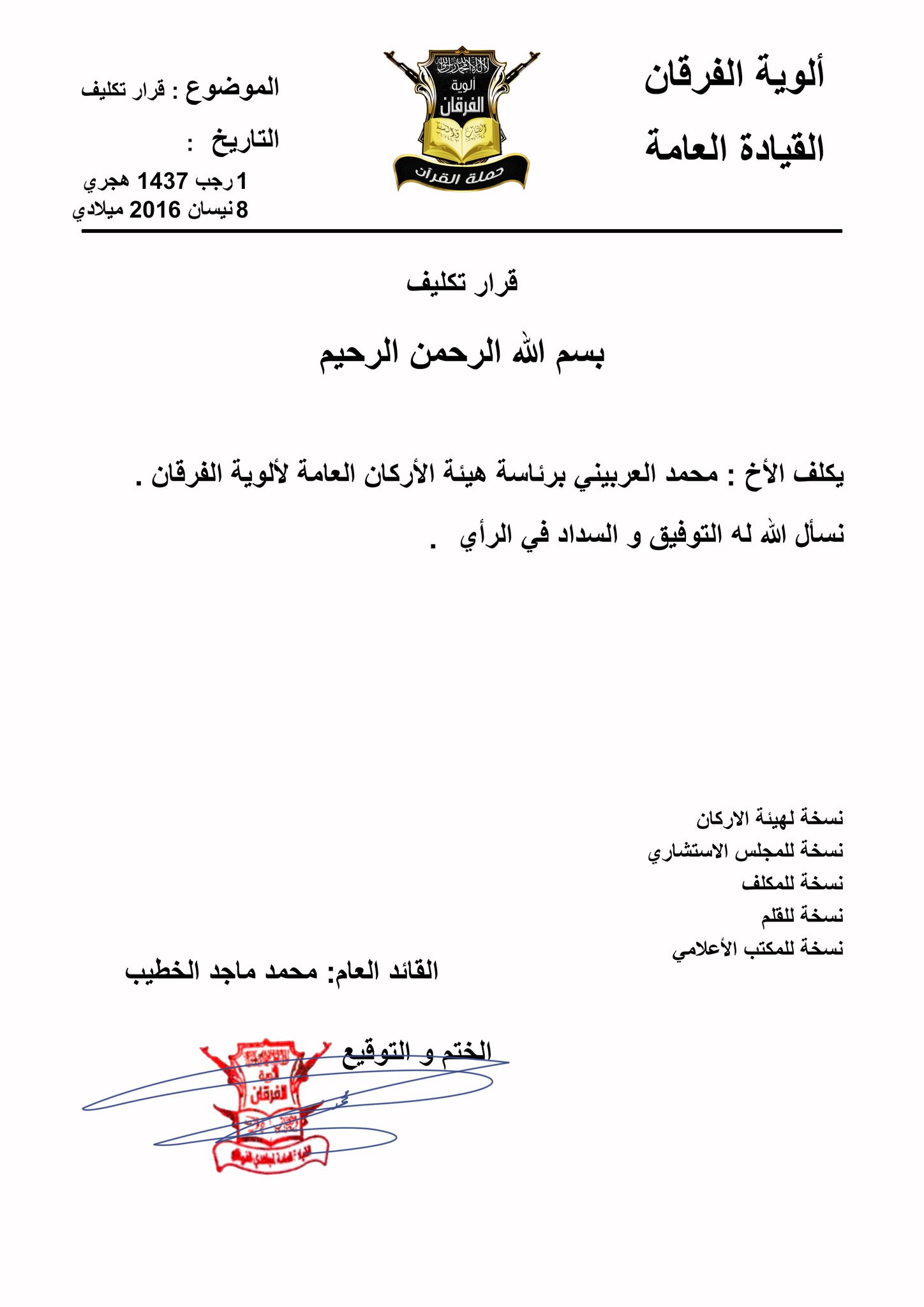 قرار تكليف محمد العربيني برئاسة أركان ألوية الفرقان