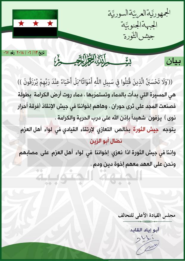 جيش الثورة يعزي لواء أهل العزم بالقيادي نضال أبو الزين