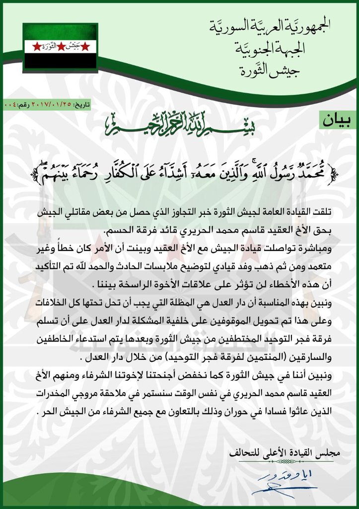 بيان حول الأحداث الأخيرة التي حصلت بين جيش الثورة وفرقة فجر التوحيد