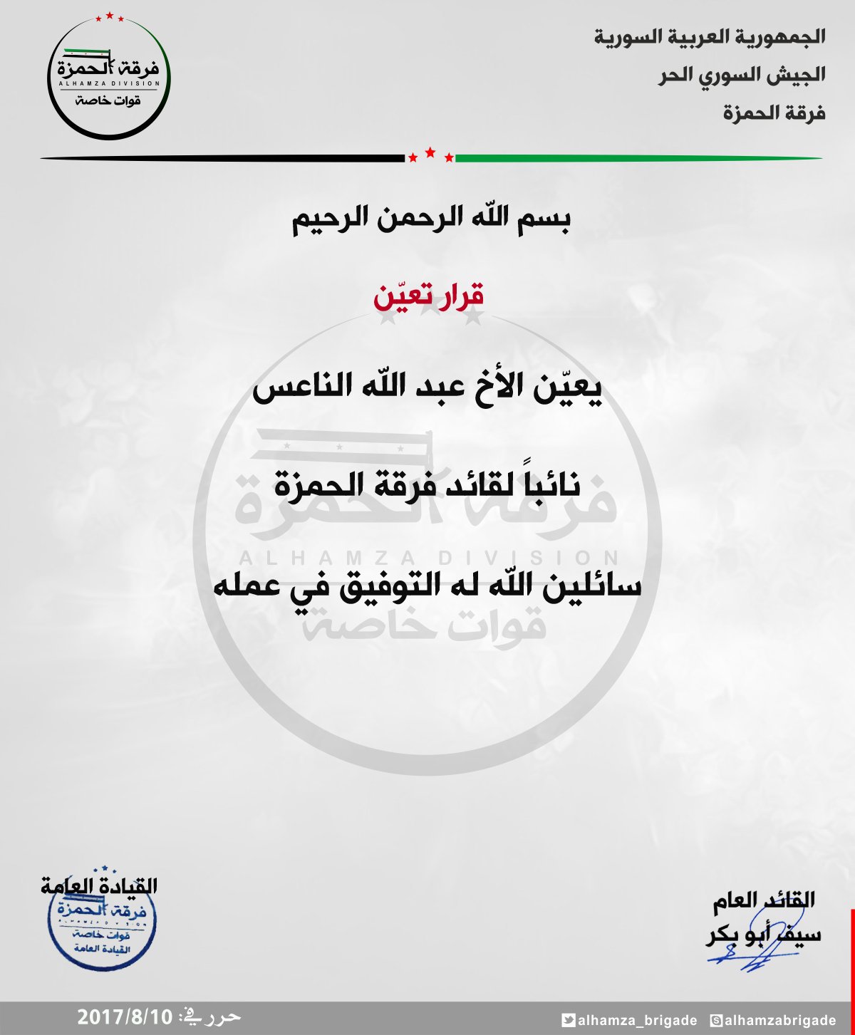 فرقة الحمزة تعين ( عبد الله الناعس ) نائباً لقائد الفرقة