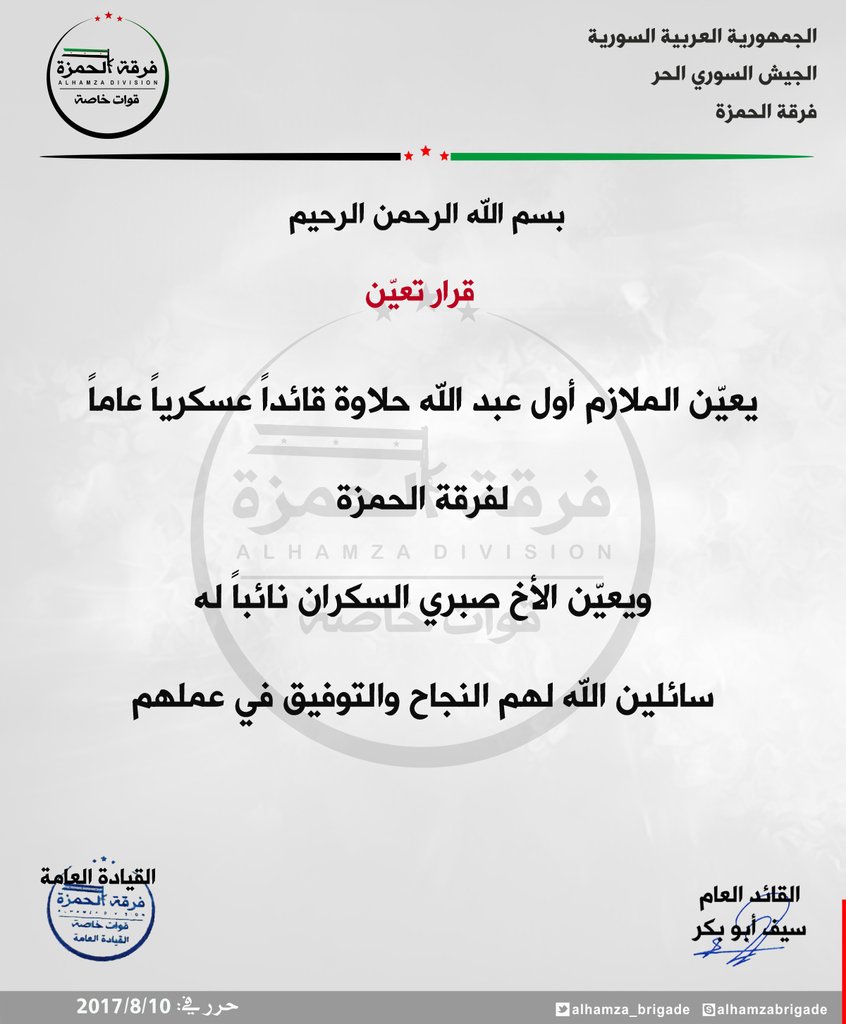 فرقة الحمزة تعين الملازم أول ( عبد الله حلاوة ) قائداً عسكرياً للفرقة