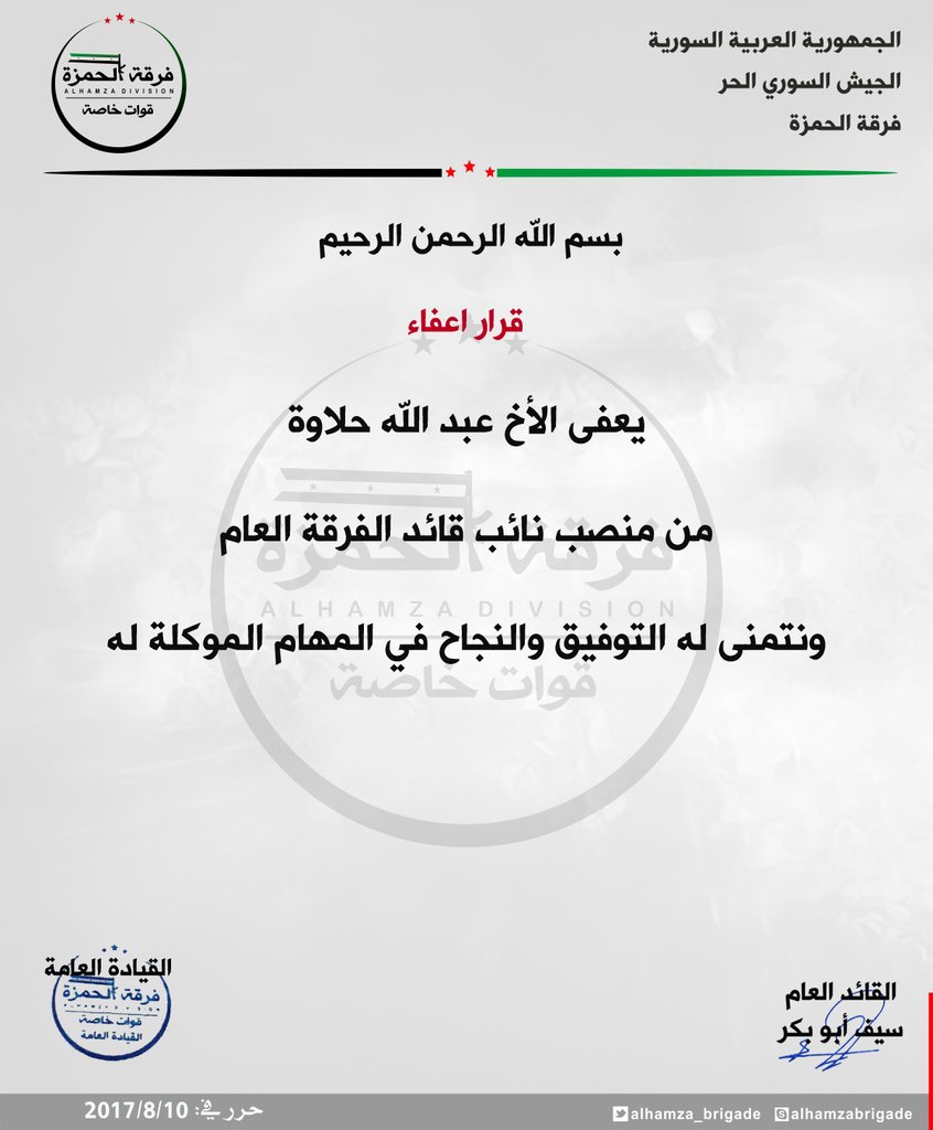 فرقة الحمزة تعفي الملازم أول ( عبد الله حلاوة ) من منصب نائب قائد الفرقة