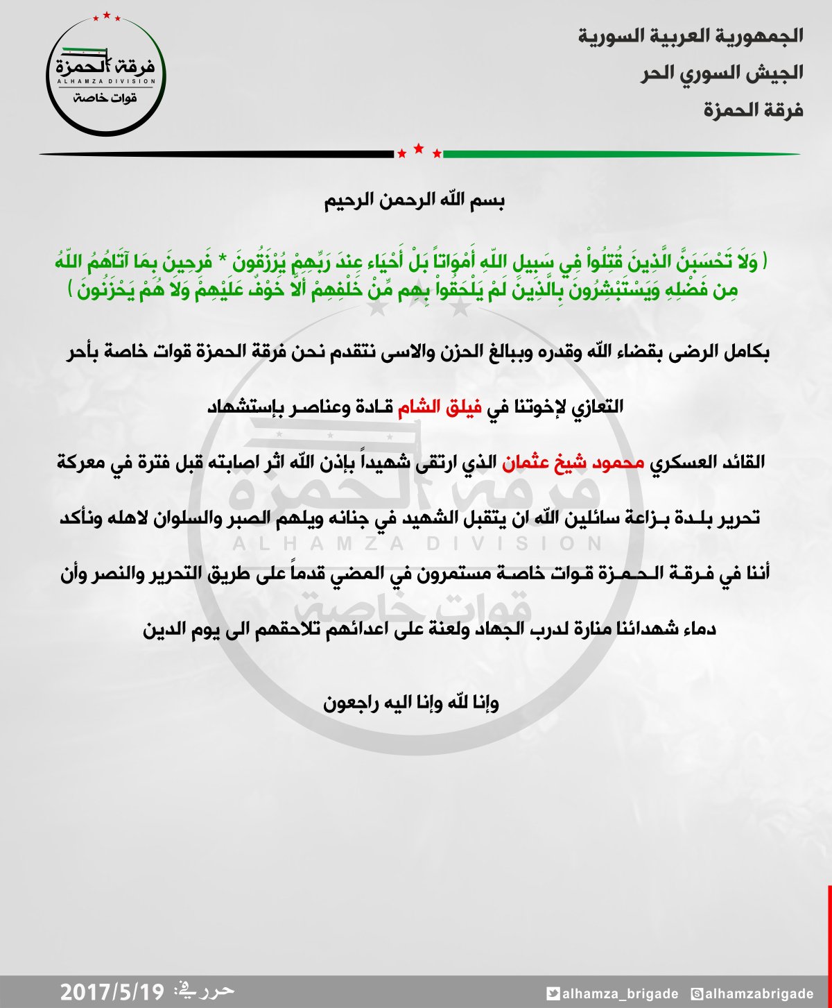 فرقة الحمزة تعزي فيلق الشام بالقائد العسكري محمود شيخ عثمان في معركة تحرير قرية بزاعة