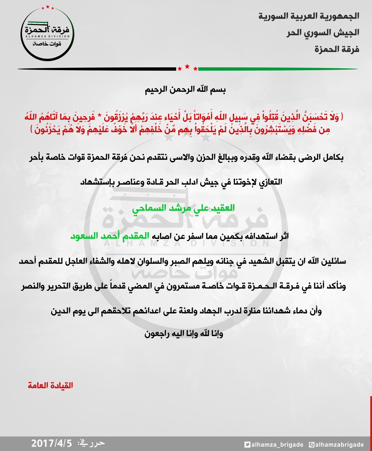 فرقة الحمزة تعزي جيش إدلب الحر بالعقيد علي مرشد السماحي