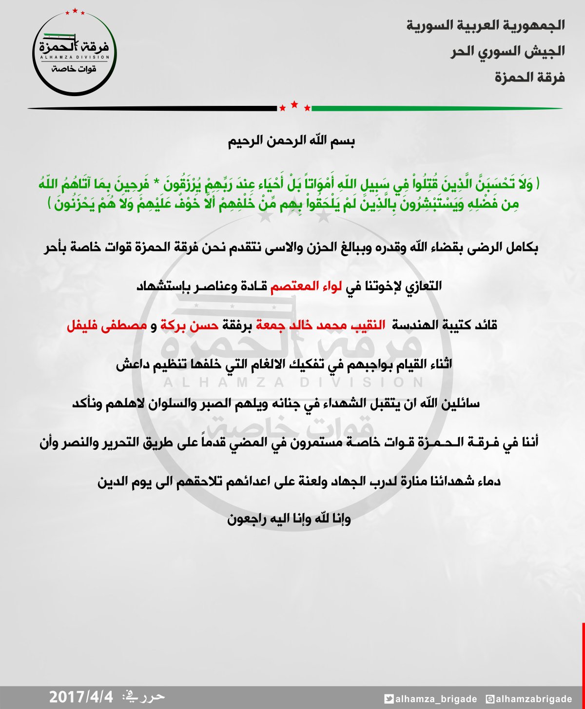 فرقة الحمزة تعزي لواء المعتصم بقائد كتيبة الهندسة محمد خالد جمعة