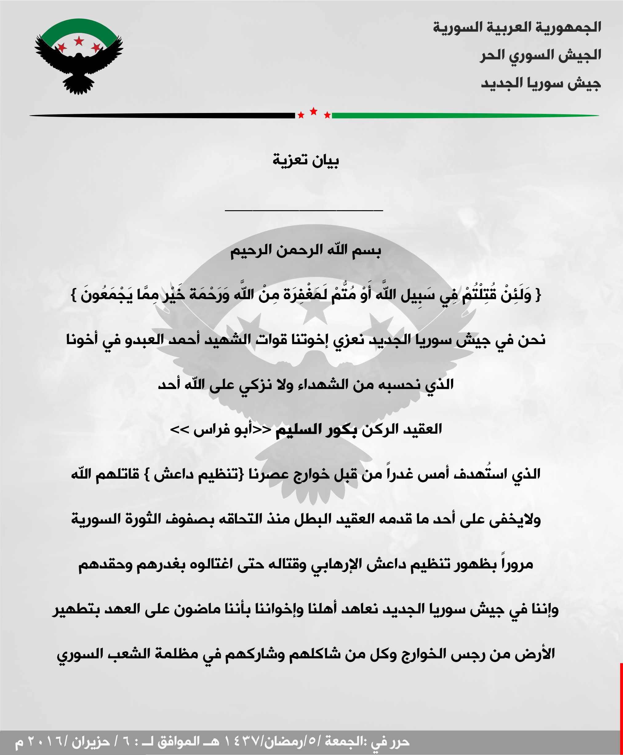 جيش سوريا الجديد يعزي قوات الشهيد أحمد العبدو بقائدها العقيد بكور السليم