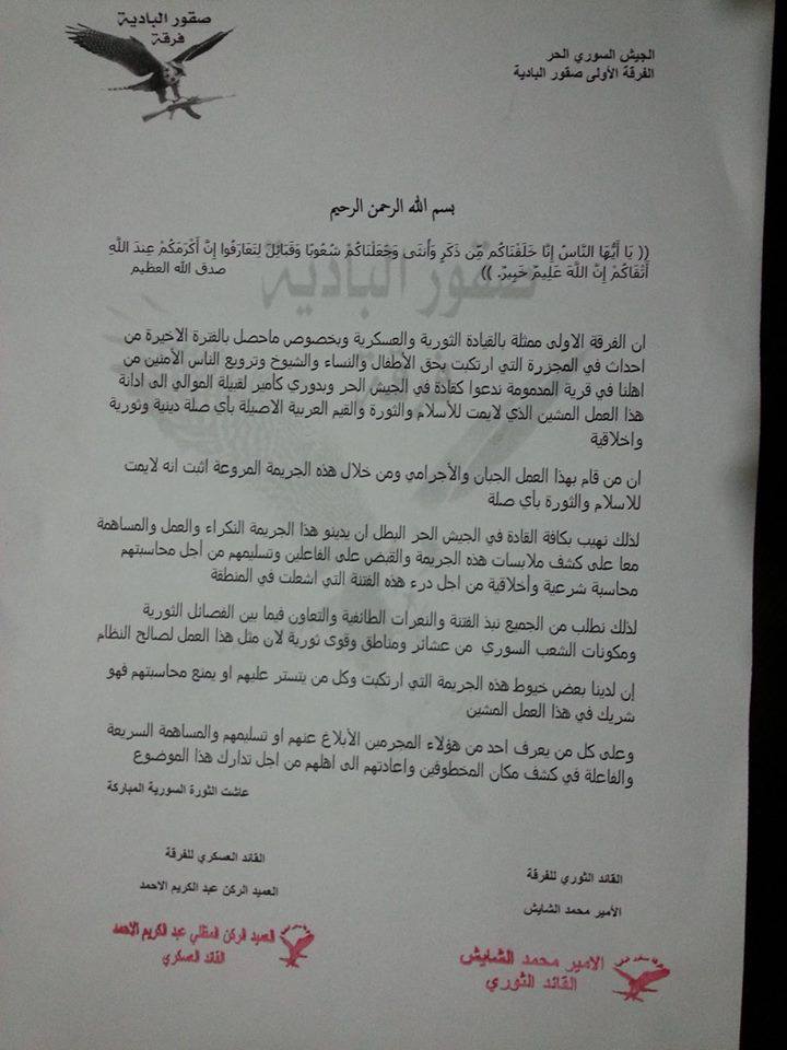 بيان إدانة من الفرقة الأولى صقور البادية للمجزرة التي حصلت في قرية المدمومة وتدعو قادة الجيش الحر لإدانتها