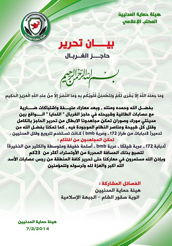 بفضل الله ومنته ورحمته وبعد معارك عنيفة وضارية خاضها ابطالنا المجاهدون مع عصابات الطاغية تم تحرير حاجز الغربال " اللحايا " بالكامل وقتل العشرات من جنود الأسد وتدمير دبابتين من طراز T72 واغتنام :