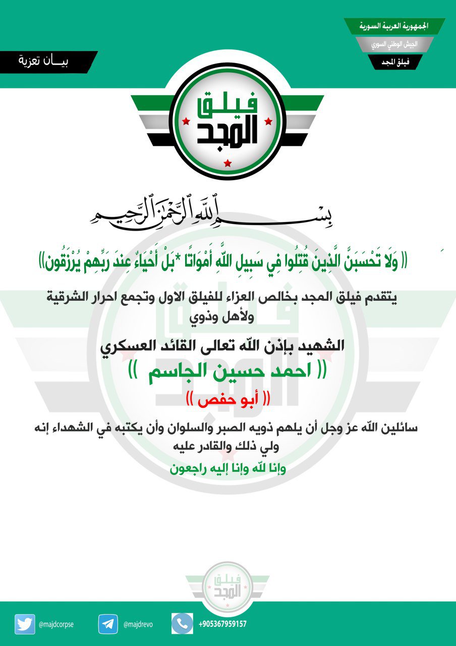 فيلق المجد يعزي الفيلق الأول وتجمع أحرار الشرقية بالقائد العسكري أحمد حسين الجاسم