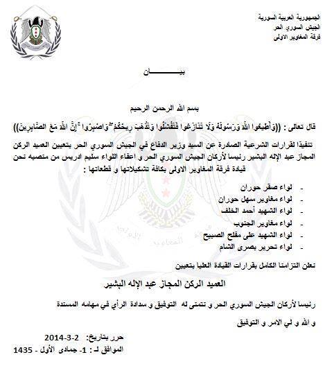 فرقة المغاوير الأولى تعلن التزامها الكامل بقرارات القيادة العليا بتعيين العميد الركن المجاز عبد الإله البشير رئيسا لأركان الجيش السوري الحر