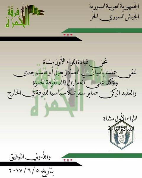 قيادة اللواء الأول مشاة تنفي علمها بقرار عزل ( أبو قاسم جدي ) من قيادة فرقة الحمزة في درعا وتؤكد أنه مازال القائد للفرقة