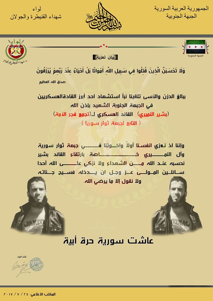 لواء شهداء القنيطرة والجولان يعزي جبهة ثوار سوريا بالقائد بشير النميري