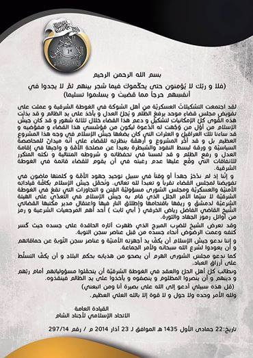 و إنَّنا إذ لم ندَّخرْ جهداً أو وقتاً في سبيلِ توحيدِ جهودِ الأمَّة و كلمتها ماضون في تفويضنا لمجلسِ القضاء تقرباً و تعبداً لله تعالى. ونُحمِّل جيشَ الإسلام بكافَّة قياداتِه الأمنيَّة والعسكريَّة ومجلس الشورى مسؤوليَّةَ الفِتن و التجاوزاتِ التي تقعُ في الغوطة الشرقيَّة لا سيَّما الأمر الجلل الذي قام به جيشُ الإسلامِ في التَّعدِّي على الهيئة الشرعيَّة لدمشقَ و ريفِها باقتحامها وإطلاق النار فيها واعتقالِ مدير مكتبها القضائي الشَّيخ القاضي الفاضل رياض الخرقي ( أبي ثابت ) أحد أهم المرجعيات الشرعية و رمز من أوائل رموز الجهاد والثورة.