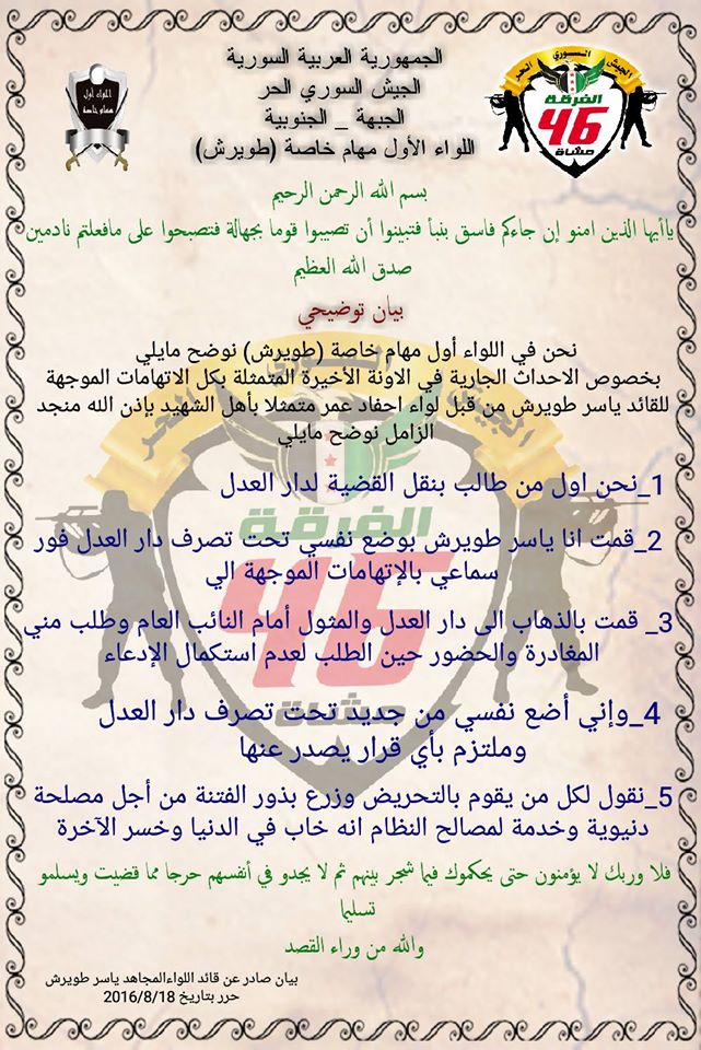 بيان من اللواء الأول مهام خاصة بخصوص الإتهامات الموجهة لقائده ياسر طويرش من قبل لواء أحفاد عمر