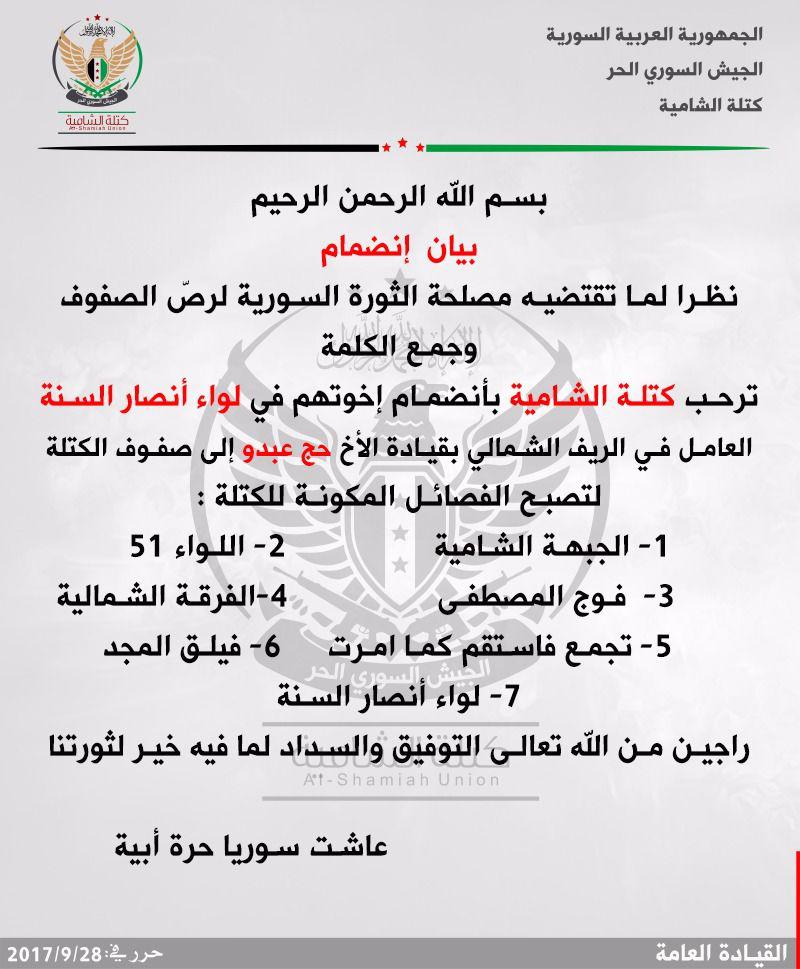 الكتلة الشامية ترحب بانضمام لواء أنصار السنة العامل في الريف الشمالي إلى صفوفها