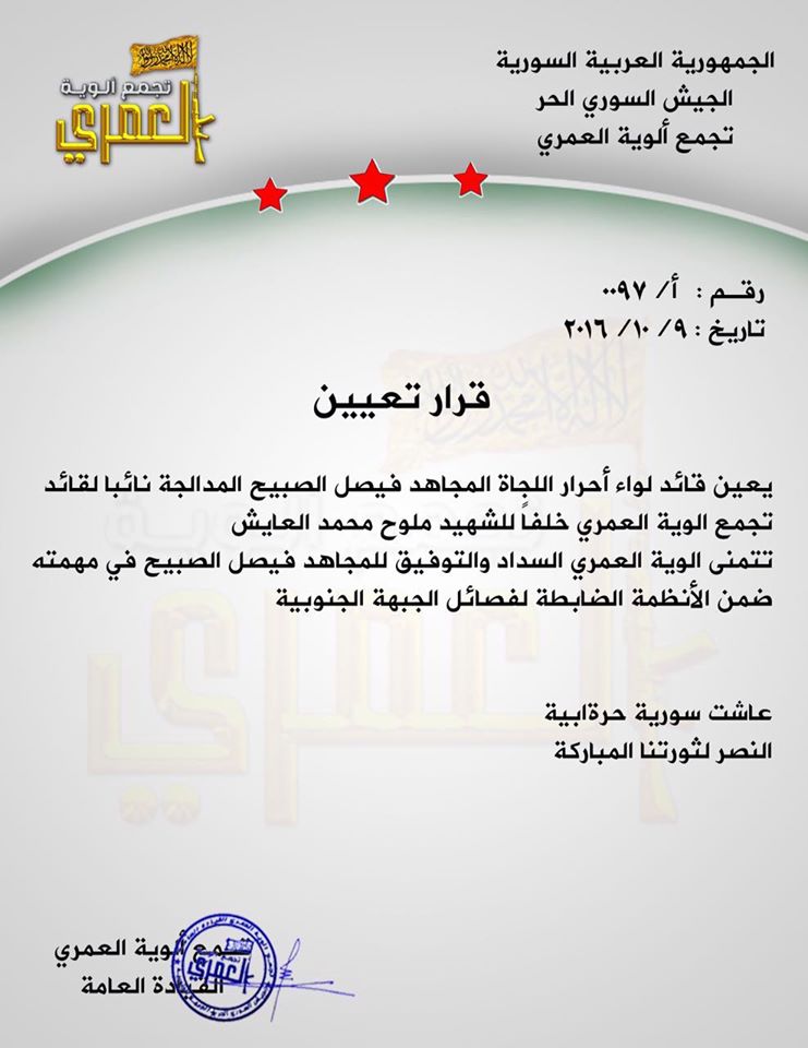 قرار إداري بتعيين ( فيصل صبيح المدالجة ) نائباً لقائد تجمع ألوية العمري