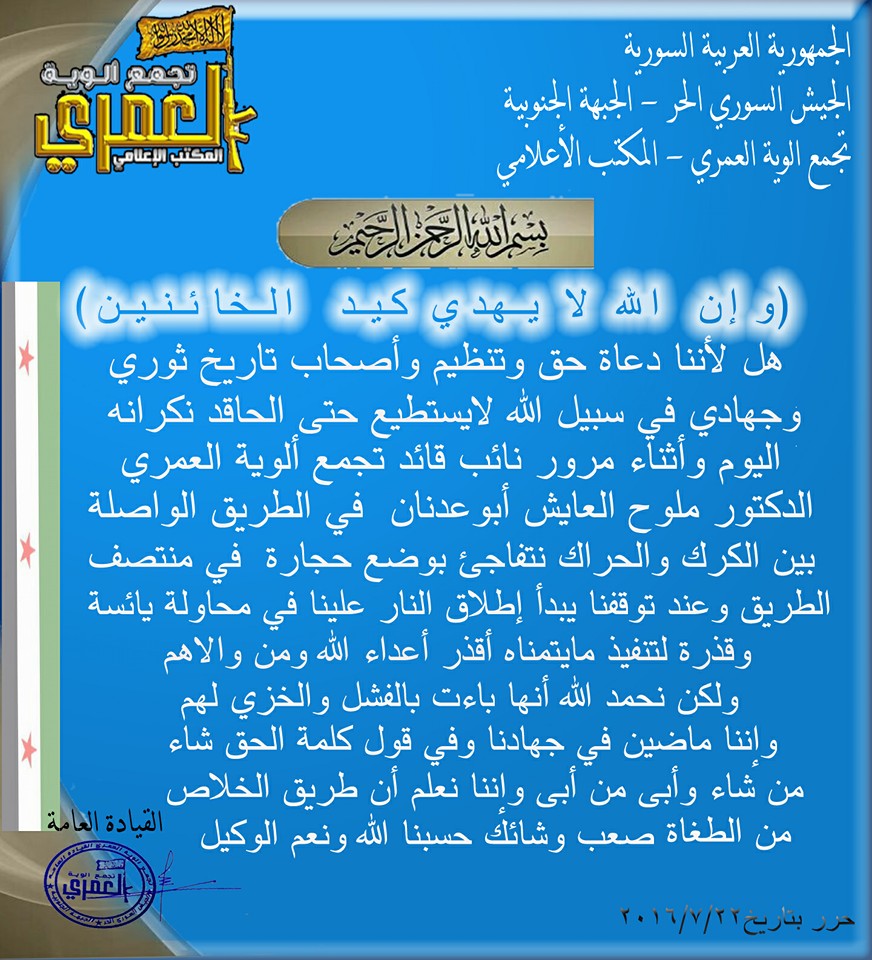 بيان محاولة اغتيال الدكتور ملوح العايش نائب القائد العام لتجمع ألوية العمري