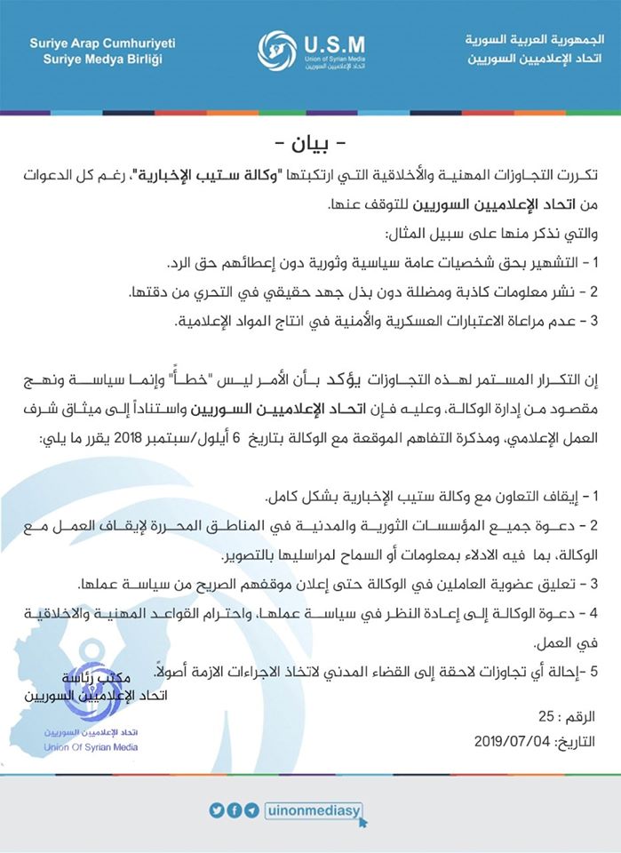 بيان من اتحاد الإعلاميين السوريين حول التجاوزات المهنية و الأخلاقية التي ترتكبها وكالة ستيب الإخبارية