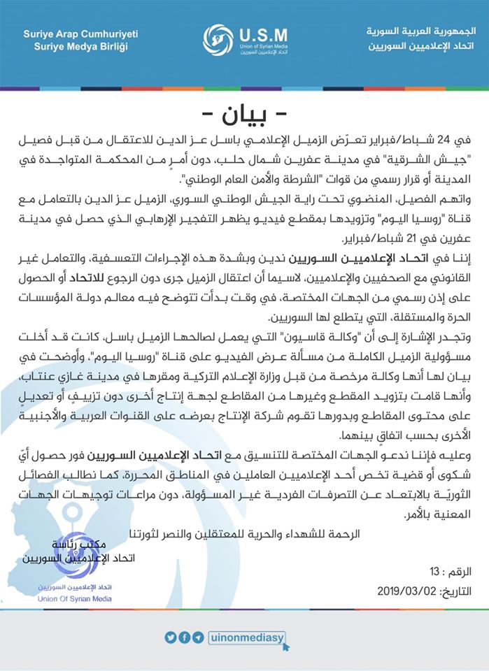 اتحاد الإعلاميين السوريين يدين قيام فصيل أحرار الشرقية باعتقال الإعلامي باسل عز الدين في عفرين
