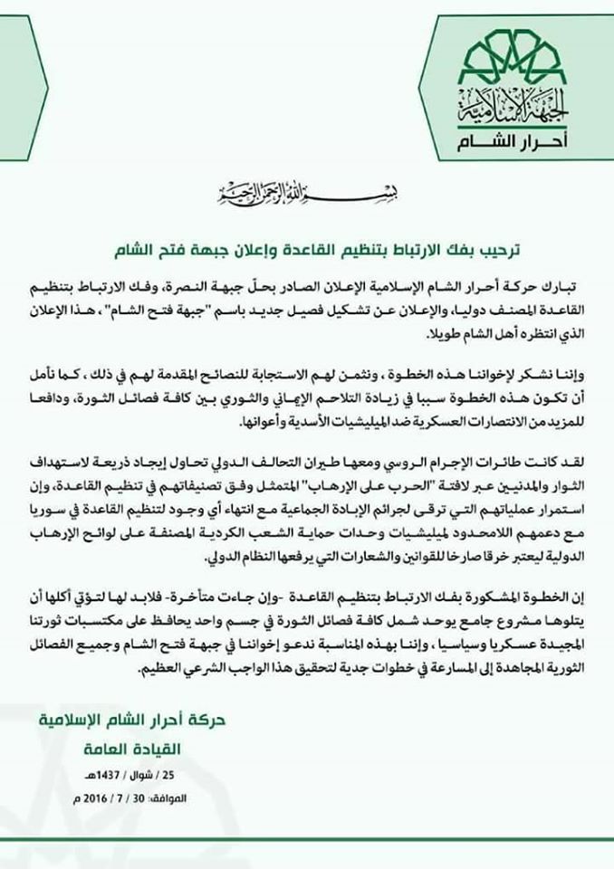 حركة أحرار الشام الاسلامية .. تبارك قرار جبهة النصرة لفك ارتباطها بتنظيم القاعدة واعلان جبهة فتح الشام