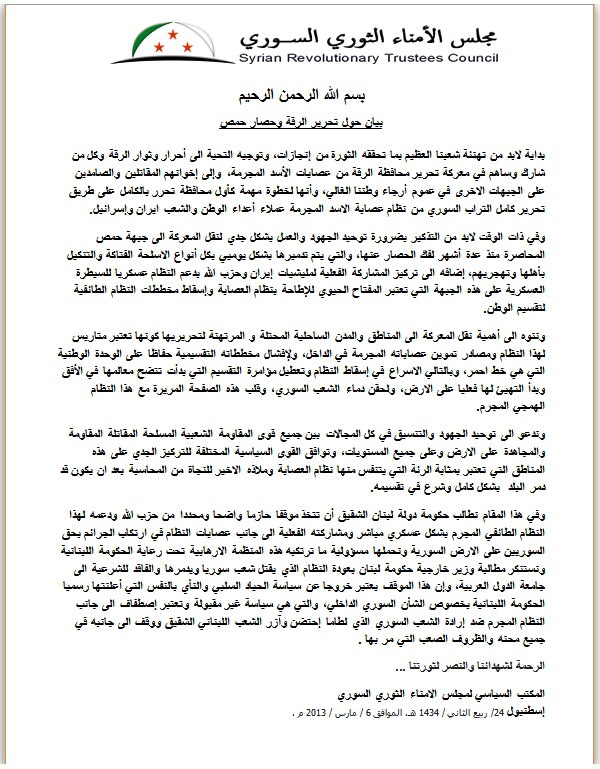بيان من مجلس الأمناء الثوري السوري حول تحرير الرقة وحصار حمص