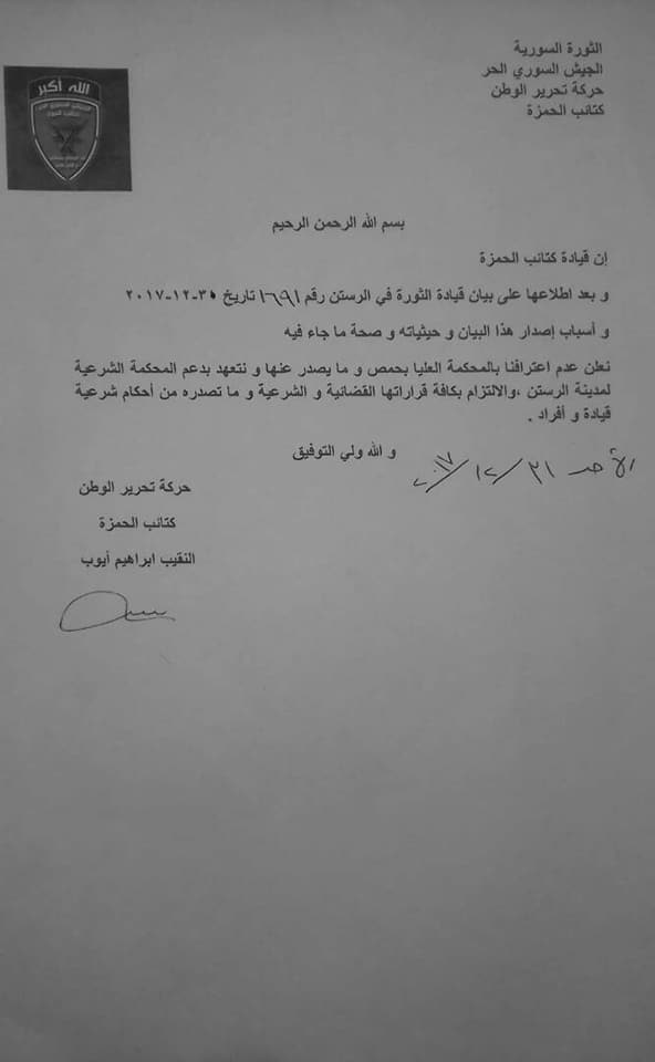 كتائب الحمزة - حركة تحرير الوطن تعلن عدم اعترافها بالمحكمة الشرعية العليا لحمص وتتعهد بدعم المحكمة الشرعية بالرستن