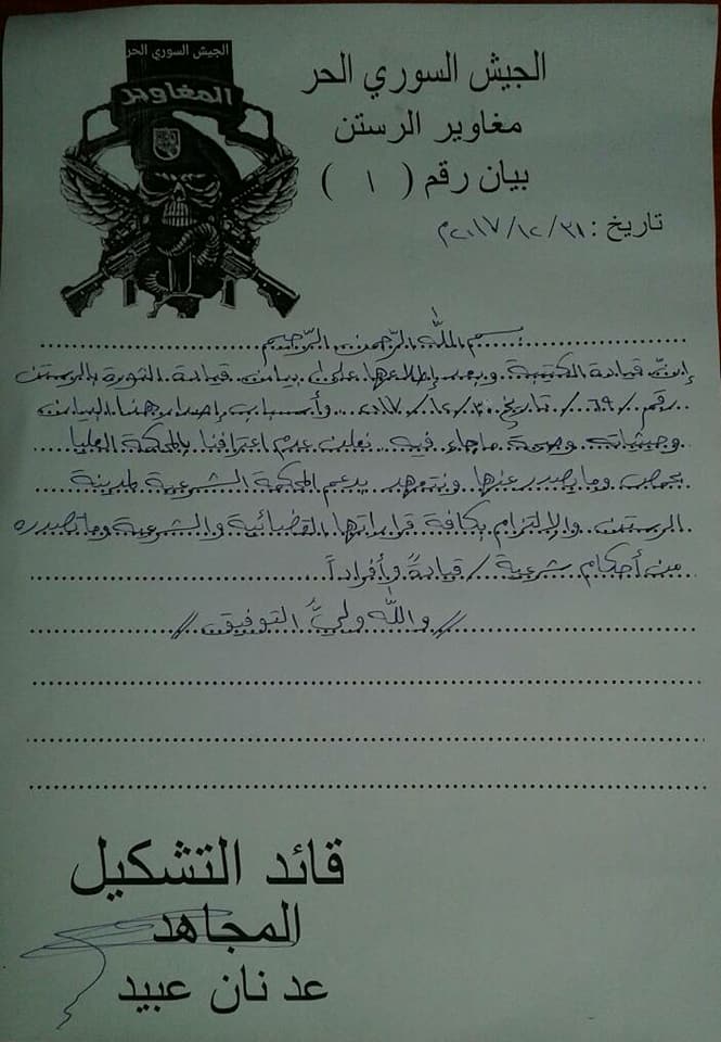 قيادة كتيبة مغاوير تعلن عدم اعترافها بالمحكمة الشرعية العليا لحمص وتتعهد بدعم المحكمة الشرعية بالرستن