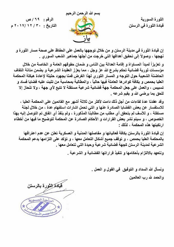 قيادة الثورة في الرستن تعلن عدم اعترافها بالمحكمة الشرعية العليا لحمص وتتعهد بدعم المحكمة الشرعية بالرستن