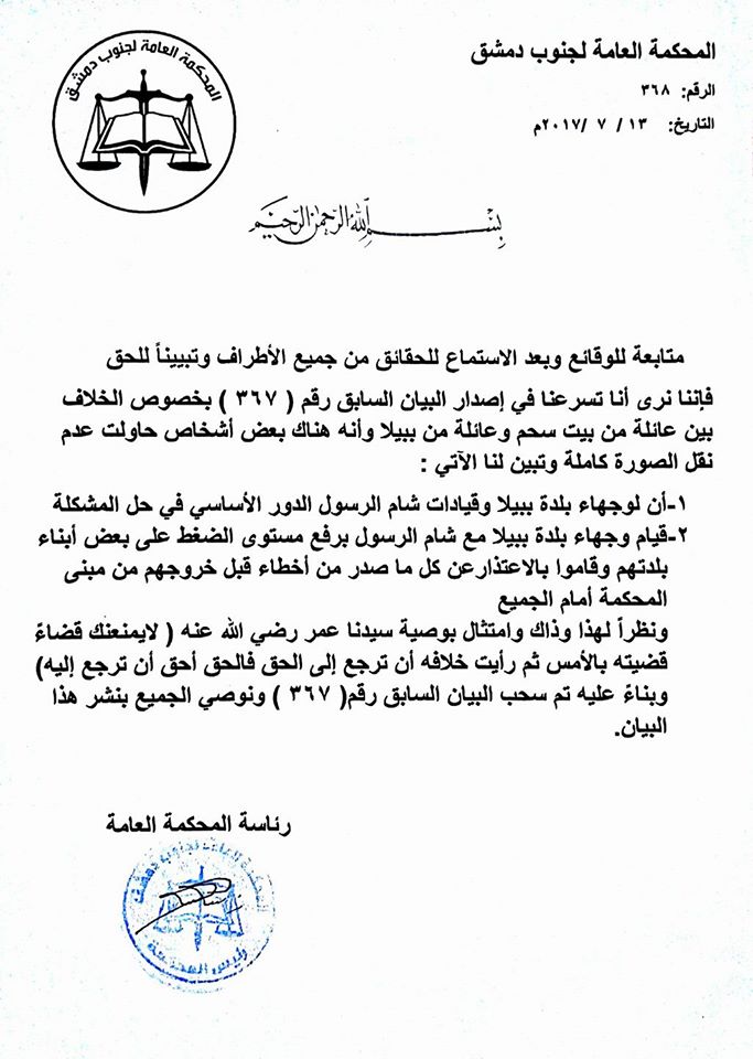 بيان من المحكمة العامة لجنوب دمشق حول البيان ( 367 ) الذي أصدرته