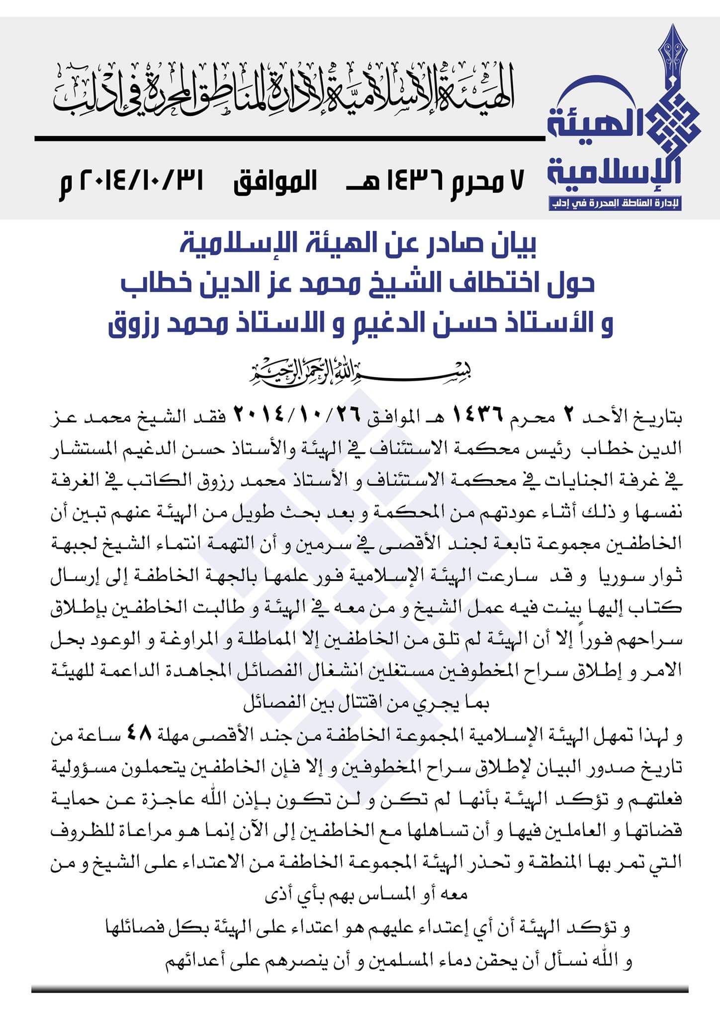 بيان من الهيئة الإسلامية لإدارة المناطق المحررة اختطاف الشيخ محمد عزالدين خطاب والأستاذ حسن الدغيم والأستاذ محمد رزوق