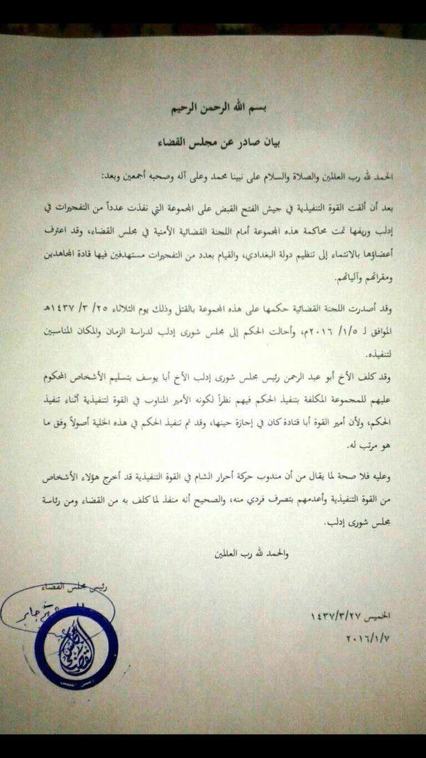 بيان من مجلس القضاء بشأن تكليف مندوب أحرار الشام في القوة التفيذية بتنفيذ حكم الإعدام بخلية تتبع لتنظيم الدولة
