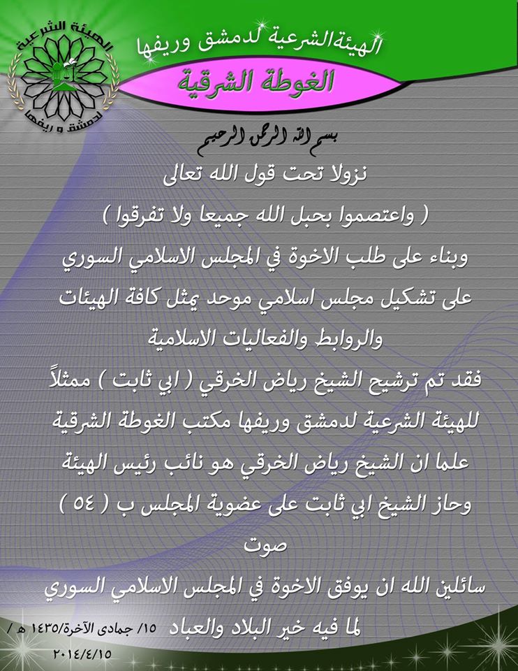 الهيئة الشرعية لدمشق وريفها ترشح الشيخ رياض الخرقي لعضوية المجلس الإسلامي ممثلاً عن الهيئة الشرعية لدمشق وريفها في الغوطة الشرقية