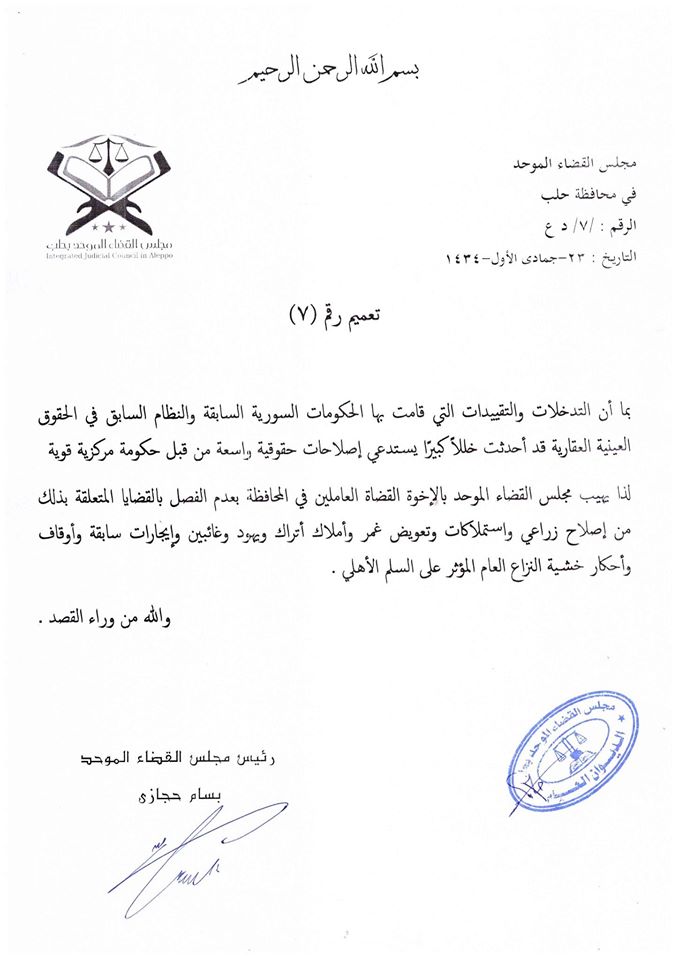 التعميم رقم (7) الصادر عن مجلس القضاء الموحد في محافظة حلب يدعو فيه القضاة العاملين في المحافظة بعدم الفصل بالقضايا المتعلقة بالحقوق العينية العقارية