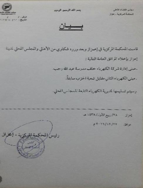قامـت المحكمة المركزية في إعــزاز وبعد ورود شكاوي من الأهالي والمجلس المحلي لمدينة إعزاز بإخلاء المرافق العامة التالية :