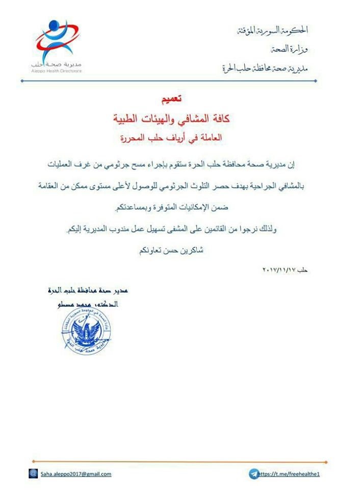 تعميم من مديرية صحة حلب الحرة إلى كافة المشافي الجراحية في أرياف حلب المحرر حول إجرائها عمليات مسح جرثومية لغرف العمليات الجراحية