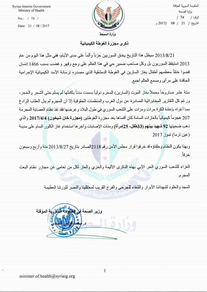 بيان من وزارة الصحة في الحكومة المؤقتة في الذكرى السنوية الرابعة لمجزرة الكيماوي في الغوطة الشرقية والتي ارتكبتها قوات النظام المجرم