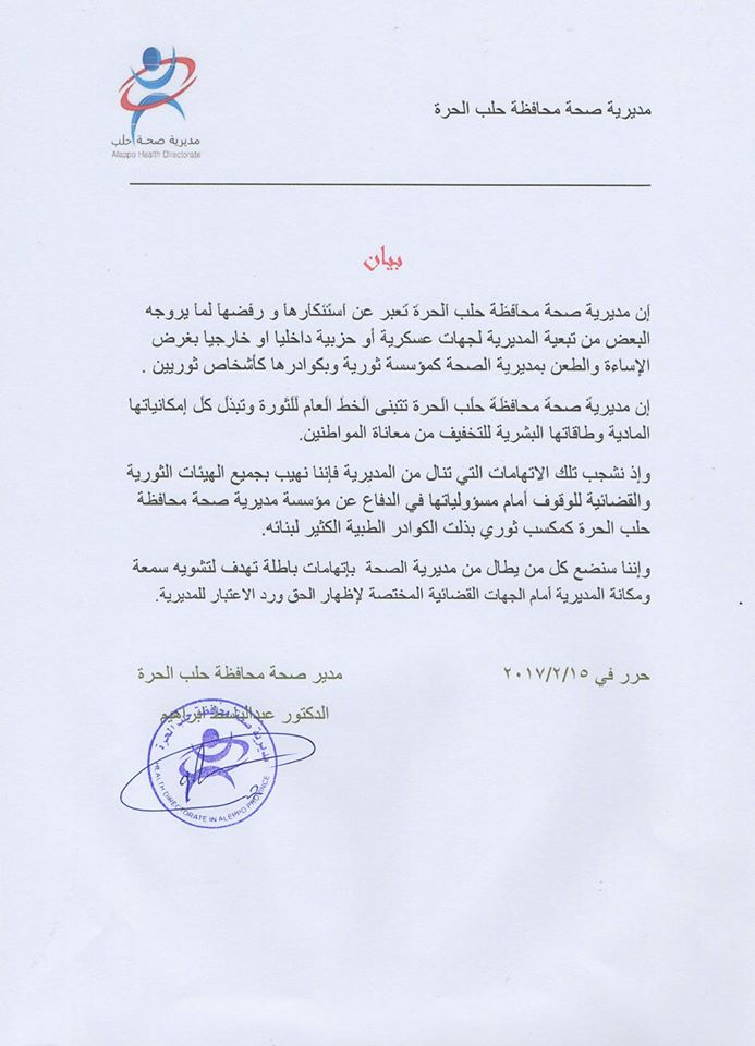 مديرية صحة حلب الحرة تعلن إدانتها واستنكارها لما يروجه البعض من تبعية المديرية لجهات عسكرية أو حزبية