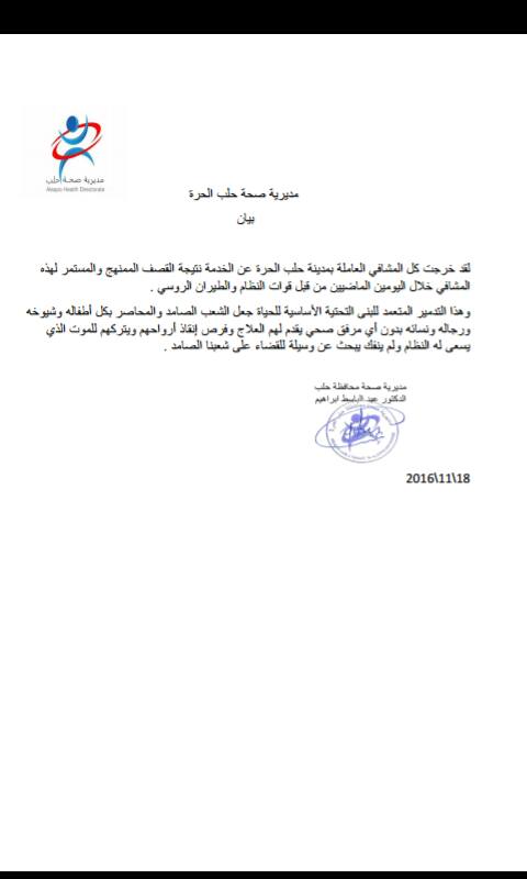 مديرية صحة حلب الحرة تعلن خروج كافة المشافي في مدينة حلب عن الخدمة نتيجة القصف الممنهج
