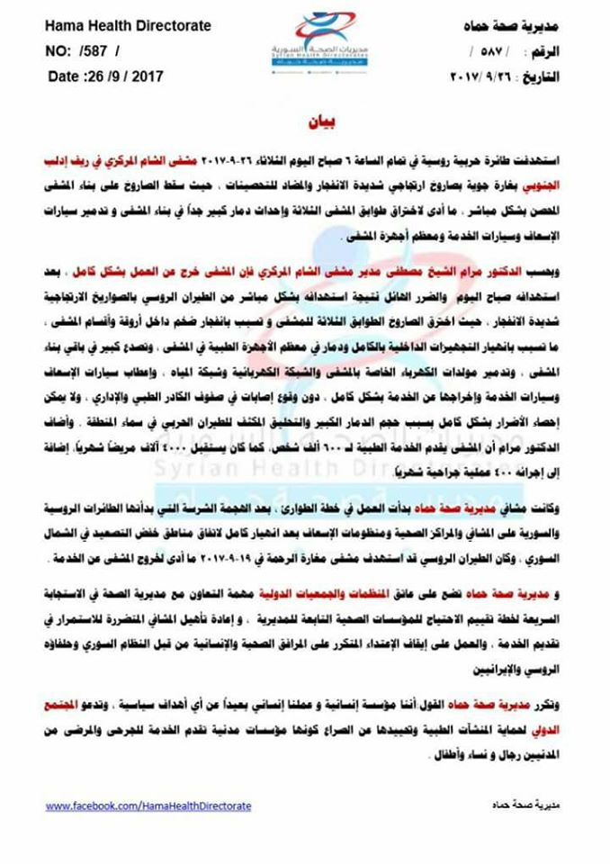 بيان من مديرية صحة حماة الحرة حول استهداف الطيران الروسي لمشفى الشام المركزي
