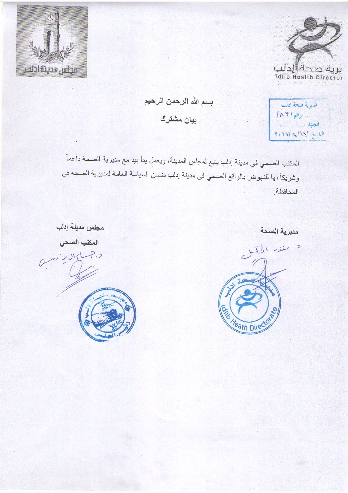 بيان مشترك بين مديرية الصحة بإدلب ومجلس مدينة إدلب بشأن التعاون بينهما