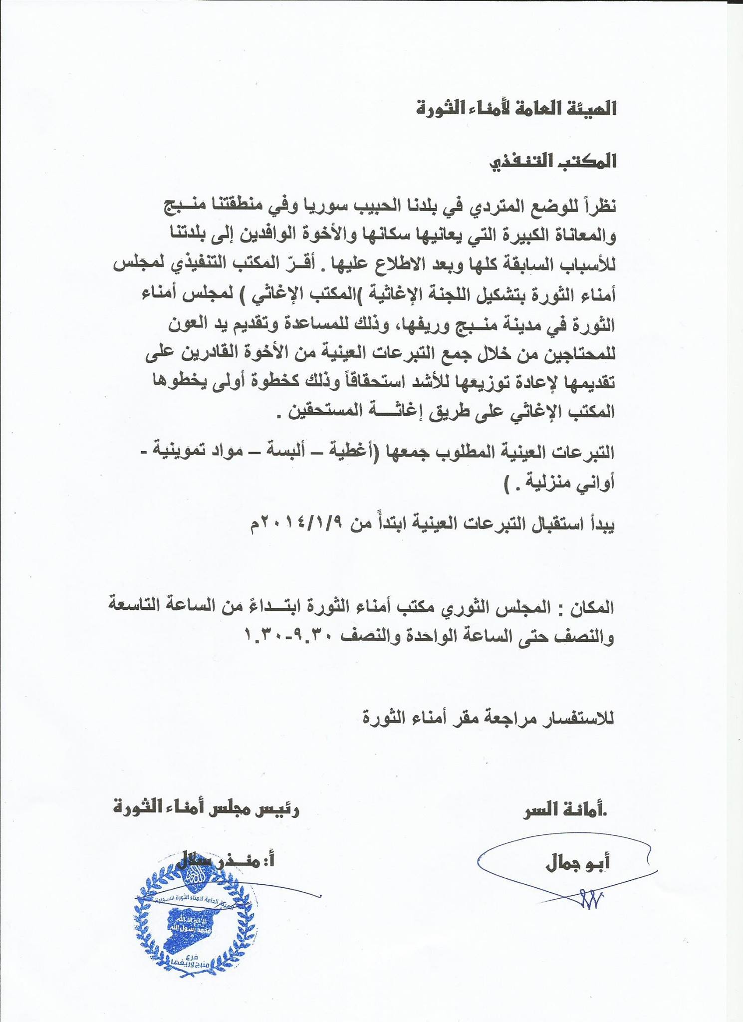 قرار من مجلس أمناء الثورة في منبج وريفها بشأن تشكيل لجنة إغاثية ومكتب إغاثي للمجلس