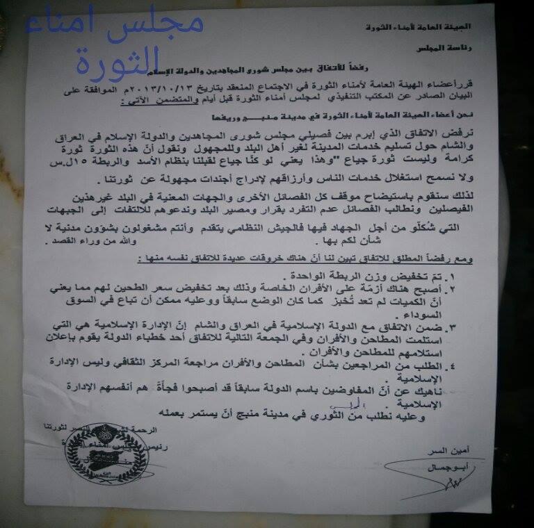 بيان صادر عن مجلس امناء الثورة في مدينة منبج وريفهابرفض الإتفاق الحاصل بين فصيلي تنظيم الدولة ومجلس شورى المجاهدين حول تسليم خدمات المدينة لغير أهل البلد