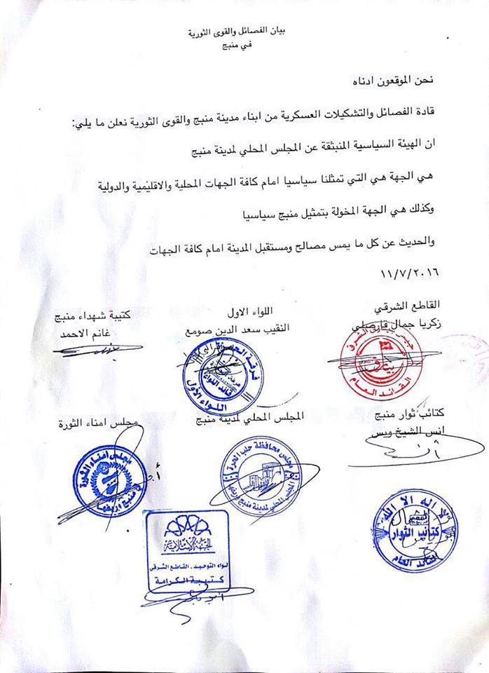 قادة الفصائل والتشكيلات العسكرية من ابناء مدينة منبج والقوى الثورية نعلن ما يلي: